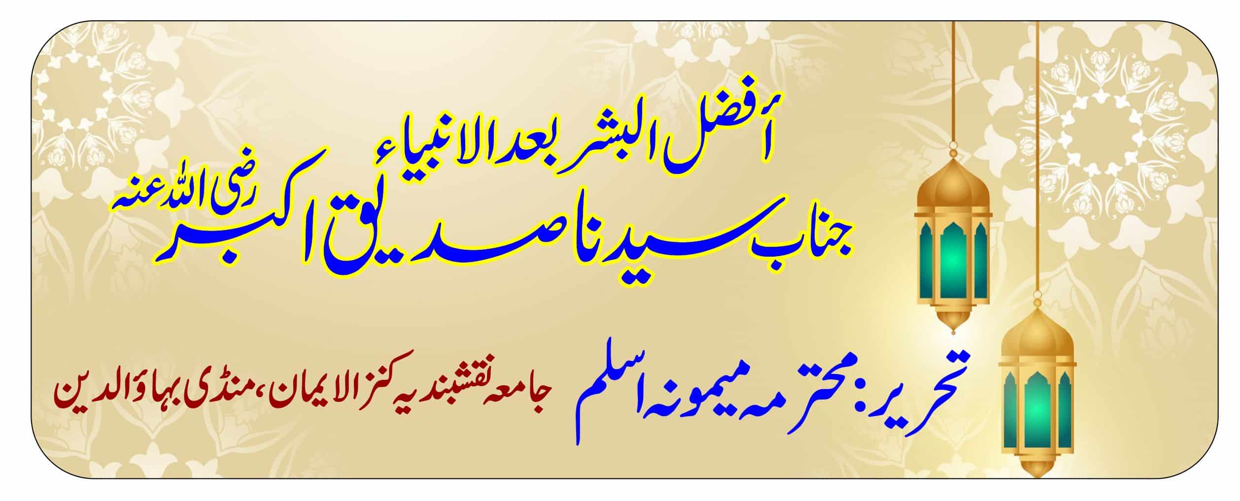 أفضل البشر بعد الانبیاء جناب سیدنا صدیق اکبر رضی اللہ عنہ تحریر :محترمہ میمونہ اسلم جامعہ نقشبندیہ کنز الایمان منڈی بہاؤالدین ماہ جمادی الثانی کا چاند طلوع ہوتے ہیں ثَانِیَ اثْنَیْنِ اِذْ هُمَا فِی الْغَارِ… أفضل البشر بعد الانبیاء جناب سیدنا صدیق اکبر رضی اللہ عنہ